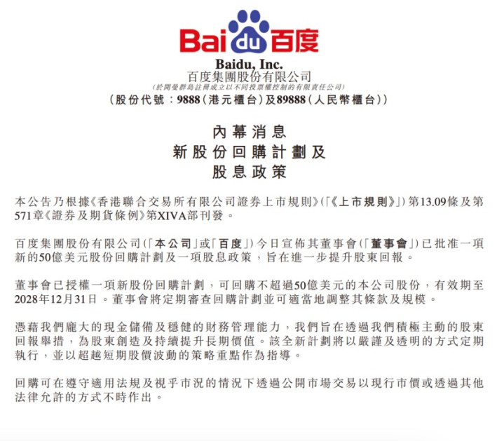 2月5日,百度集团在港交所发布公告,宣布两大股东回报举措:预计于2026年首次派发股息,并授权实施一项最高金额达50亿美元的新股票回购计划。